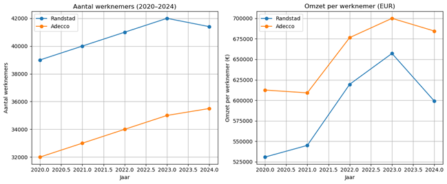 Randstad heeft minder mensen in dienst dan Adecco, maar genereert meer omzet per werknemer, wat wijst op een hogere arbeidsproductiviteit.