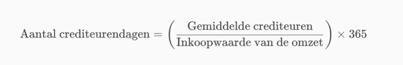 - Crediteurendagen = (Gemiddelde crediteuren / Inkoopwaarde omzet) × 365